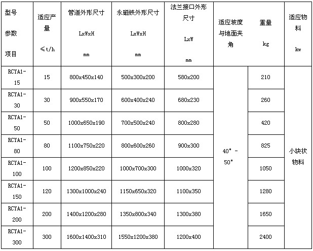 RCYA1、RCYA2系列管道式永磁除鐵器包括無(wú)磁管道和永磁鐵兩部分,****于對(duì)封閉管道內(nèi)非磁性物料除鐵、永磁除鐵器內(nèi)部采用高性能稀土強(qiáng)磁材料組成復(fù)合磁系。具有體積小、磁力大、重量輕、除鐵干凈、方便、無(wú)能耗、使用壽命長(zhǎng)等特點(diǎn)。適合于無(wú)輸送皮帶,只能提供下料溜槽的場(chǎng)合。當(dāng)散狀物料經(jīng)過(guò)管道式永磁除鐵器時(shí),鐵雜物被高場(chǎng)強(qiáng)的永磁鐵所吸附,清除鐵雜質(zhì)時(shí),打開(kāi)管道****門將雜質(zhì)取出。該設(shè)備適用于含鐵量較少的場(chǎng)合,含鐵較多的場(chǎng)合,應(yīng)選用自卸式除鐵器或RCYG系列精細(xì)除鐵器。主要應(yīng)用于水泥、化工、煤炭、塑料、耐火材料、建材等行業(yè)的下料管道中清除雜物。